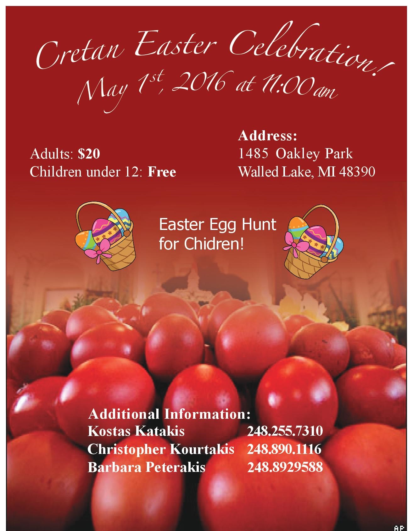 The Detroit Cretans are planning and preparing for a traditional Easter celebration. This year, the event will be held in Commerce, MI. The venue is perfect, and the event will feature traditional Cretan lamb prepared on the souvla along with activities for kids!