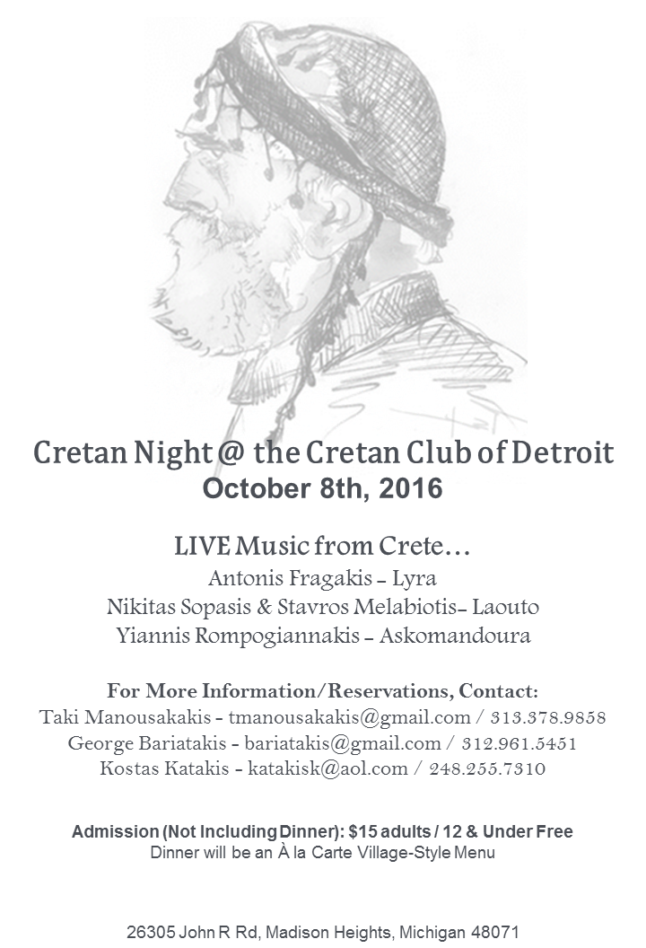 The CRETAN FRATERNITY of DETROIT “PSELORETES” invites you to a Cretan Glendi on Saturday October 8, 2016 at the Cretan Club of “PSELORETES”